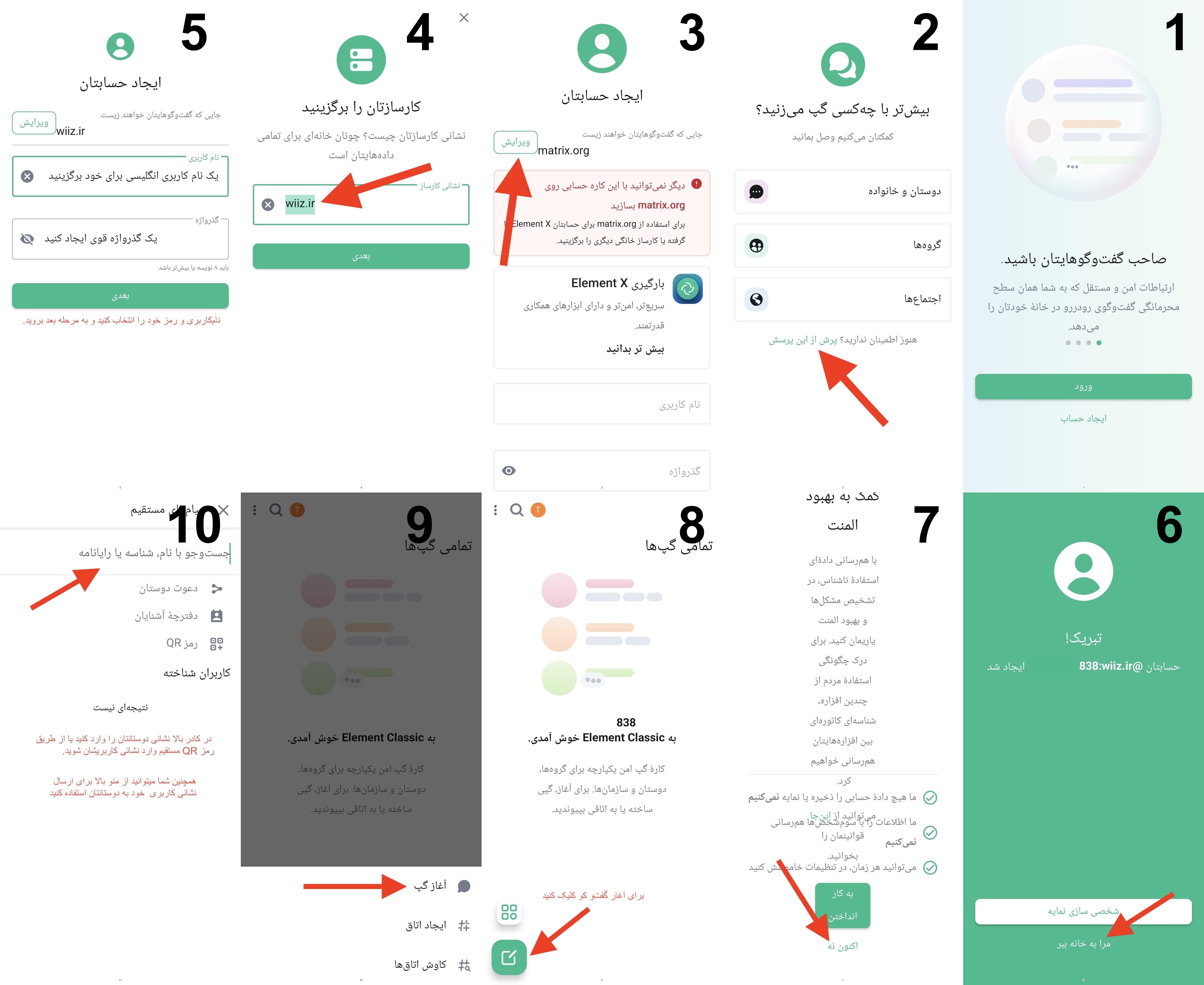 توصیه مهم: از سرور پیشفرض matrix.org یا سرورهای عمومی معتبر دیگر استفاده کنید. ( میتوانید از سرور Wiiz.ir استفاده کنید). و از ساخت حساب روی سرورهای ناشناس خودداری کنید، مگر اینکه مدیر آن را کاملاً بشناسید و اعتماد صددرصدی داشته باشید. - حساب کاربری بسازید: نام کاربری شما شبیه به YourName:server.com@ خواهد بود.